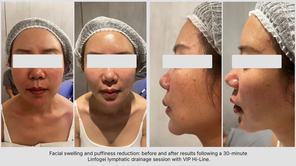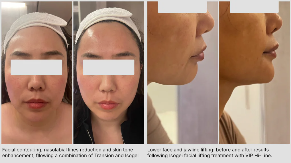 Live treatments revealed immediate and measurable results, including facial swelling and puffiness reduction following a 30-minute Linfogei lymphatic drainage session, lower face and jawline lifting achieved with Isogei facial lifting protocols, and advanced facial contouring, nasolabial line reduction, and skin tone enhancement through a combined Transion and Isogei approach. The sessions reinforced our ability to deliver effective outcomes without pain, redness, swelling, or downtime.