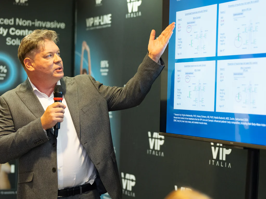 Dr Alexey Schwarz, PhD in Physiology and Cardiovascular Pharmacology from the University of Zurich, and a leading specialist in physiotherapy, presented his research into muscle stimulation using VIP Hi-Line Lipo. His work demonstrated how targeted neuromuscular activation positively influences body composition, supports muscle mass development, and enhances rehabilitation and weight management outcomes across a wide range of clinical cases.